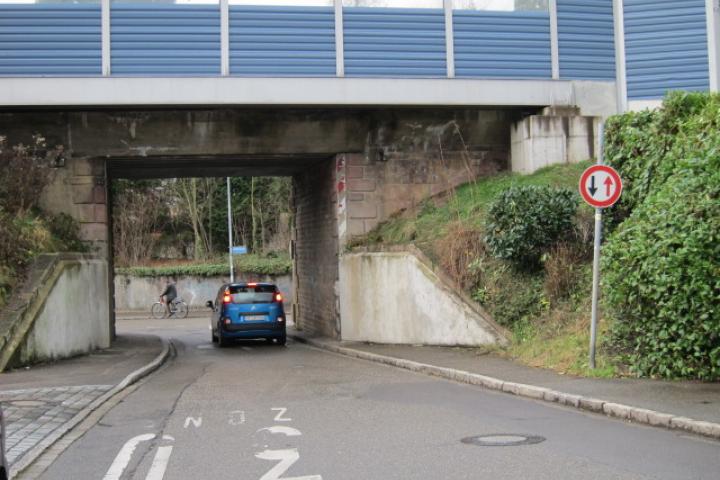 An dieser Unterführung müssen Fahrzeuge, die von Osten kommen, dem Gegenverkehr Vorrang gewähren. Diesen Gegenverkehr können sie jedoch erst erkennen, wenn sie schon in die Unterführung eingefahren sind. Daher kommt es immer wieder zu hochgefährlichen Rückstoßmanövern.